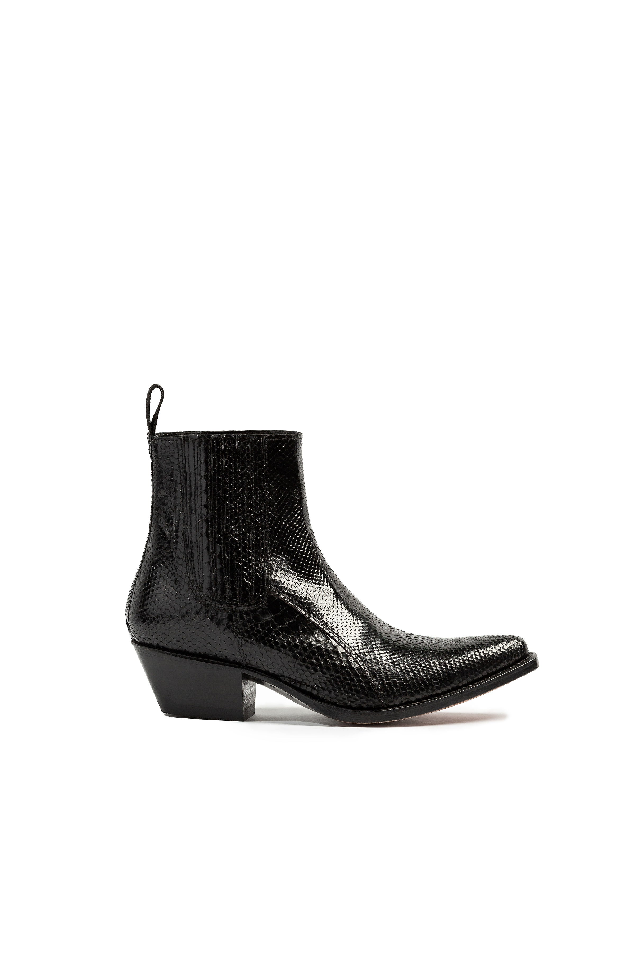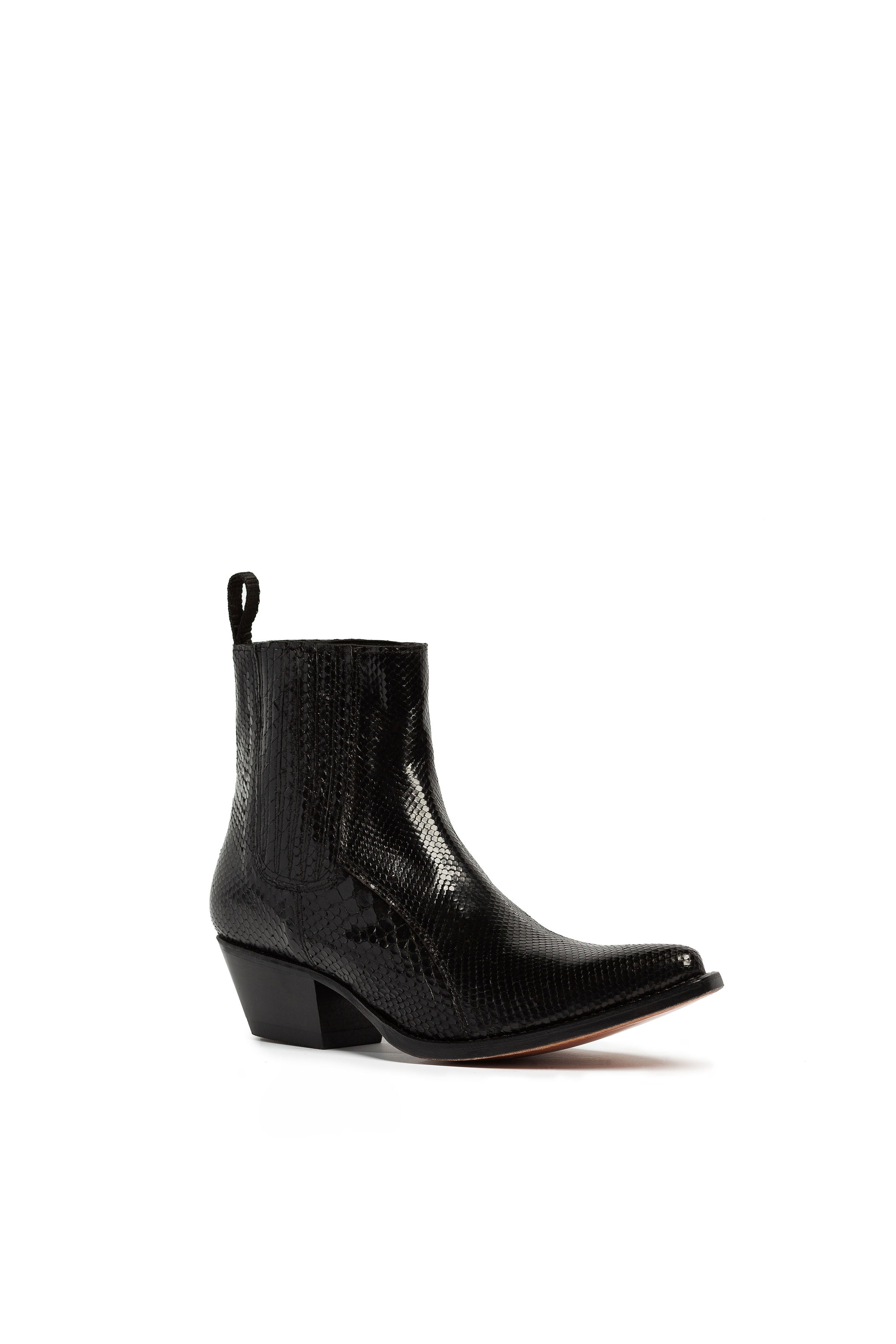 Ankle western style boots in black python leather that are handmade and have a modern style would be a versatile addition to both office and street fashion.